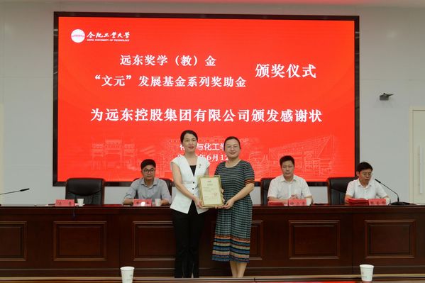 远东控股集团人力资源服务中心总监张妍妍在致辞中回顾了自2011年起,校企在人才共育、科研共创、平台共建等领域的合作成果,介绍了未来更深层次的合作规划。她表示合工大校训与远东企业使命高度契合,期待共探“新工科”育人模式,搭建产学研用一体化平台,携手为制造业强国注入青春动能。并为三位获得远东奖教金的老师颁发获奖证书。