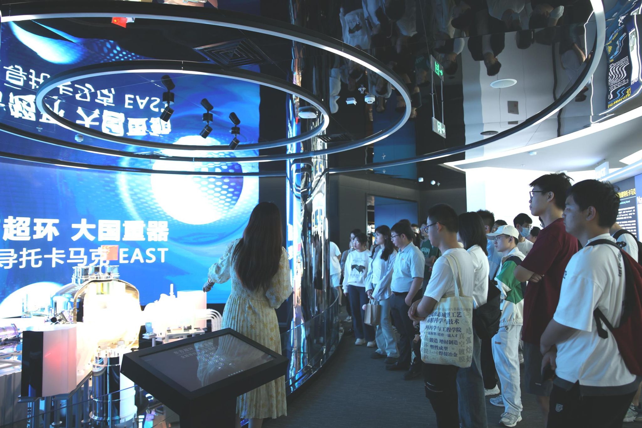 会后,共建双方赴全国科普教育基地、聚变创新展览馆开展“核你相聚,研学共建”主题党日活动。在讲解员带领下,同学们依次参观了“聚变印象”“聚变科普”“聚变征程”“聚变成果”“聚变未来”展览,馆内沉浸式数字沙盘、立体全息影像、立体形象宣传影片等现代声光电技术,展示出了磁约束核聚变大科学团队坚守初心、开拓创新,不懈追逐人类聚变能源梦想的奋斗历程。