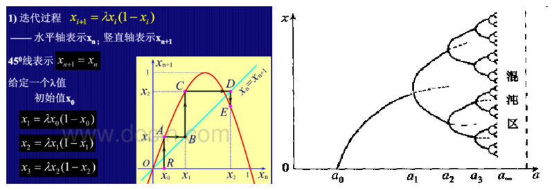 混沌系统是指在一个确定性系统中,存在着貌似随机的不规则运动,其行为表现为不确定性、不可重复、不可预测,这就是混沌现象。混沌是非线性动力系统的固有特性,是非线性系统普遍存在的现象。离散系统通常用逻辑斯蒂方程xn+1 =λxn(1-xn)表现混沌特征,λ是控制参量,其生态学解释是第xn代物种数与第xn+1代物种数的迭代,λ=0.5时,物种将灭绝;λ=1.2、2、2.7时,物种趋于稳定;λ=3.569-4范围内出现混沌。